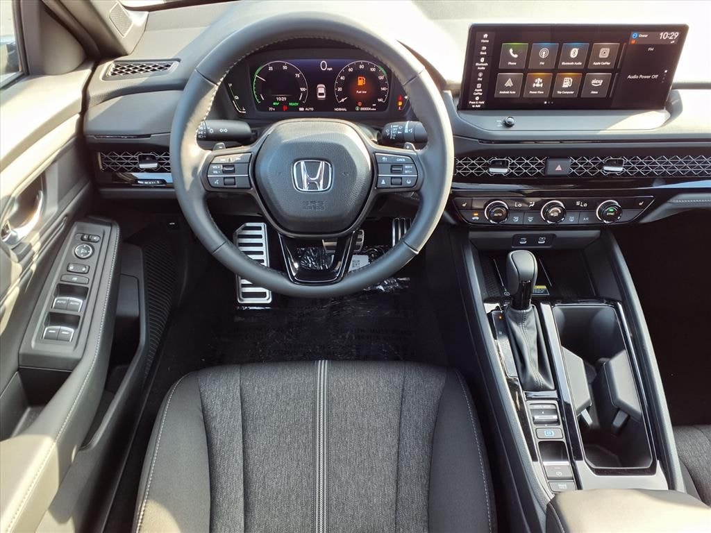 This vehicle offers Apple CarPlay for seamless connectivity. This Honda Accord Hybrid keeps you comfortable with Auto Climate. The vehicle's Forward Collision Warning system alerts the driver to potential front-end collisions, enhancing safety. Start the Honda Accord Hybrid from inside with remote start. Bluetooth technology is built into this unit, keeping your hands on the steering wheel and your focus on the road. The vehicle has auto-adjust speed for safe following. See what's behind you with the back up camera on this 2025 Honda Accord Hybrid . This mid-size car offers Android Auto for seamless smartphone integration. The vehicle has a 4 Cyl, 2.0L high output engine. Maintaining a stable interior temperature in this unit is easy with the climate control system. This Honda Accord Hybrid has an elegant black exterior finish. Front wheel drive on this vehicle gives you better traction and better fuel economy. Easily set your speed in the Honda Accord Hybrid with a state of the art cruise control system. Increase or decrease velocity with the touch of a button.